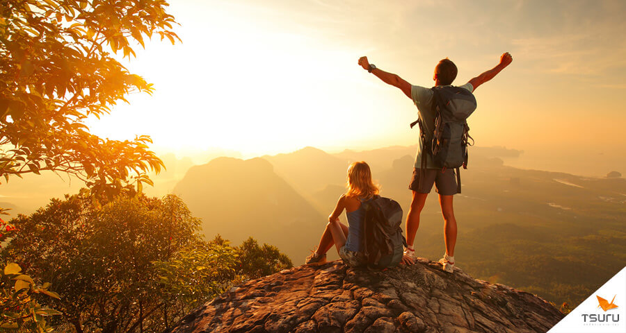 Dois aventureiros iniciando uma trilha cercada de árvores e neblina]